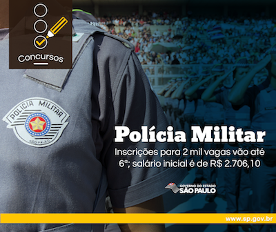 Estão abertas até 6 de junho, às 16h, as inscrições no concurso da Polícia Militar que vai contratar dois mil sodados PM de 2ª classe, masculino e feminino. O salário inicia lé de R$ 2.706,10. As inscrições são realizadas somente pela internet, site da Vunesp.