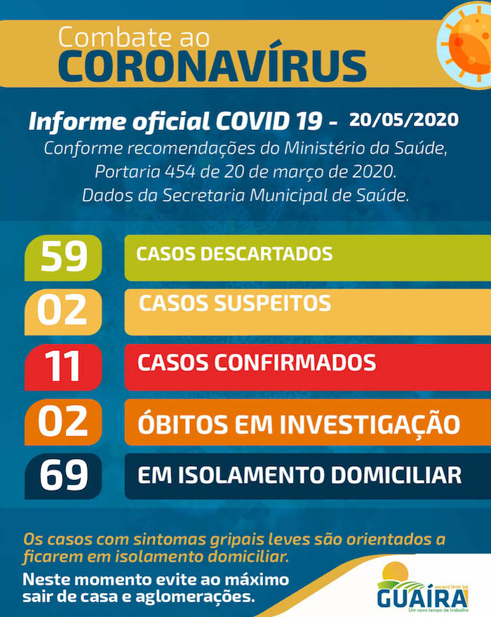 A Prefeitura por meio Departamento da Vigilância Epidemiológica da Secretaria Municipal da Saúde e do Grupo Técnico de Trabalho para o Monitoramento, Prevenção e Combate do Coronavírus, confirmam mais cinco casos de COVID-19 em Guaíra, nesta quarta-feira (20).