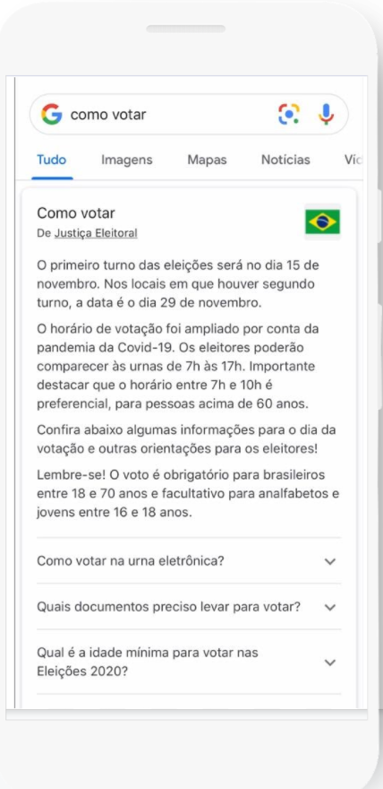 Para ajudar em sua jornada para votar bem informado e com segurança nas eleições municipais em novembro, estamos anunciando hoje, em parceria com o Tribunal Superior Eleitoral (TSE), novos recursos na Busca que vão permitir que todos os brasileiros acompanhem as principais datas, informações e respostas às dúvidas frequentes sobre o processo eleitoral.