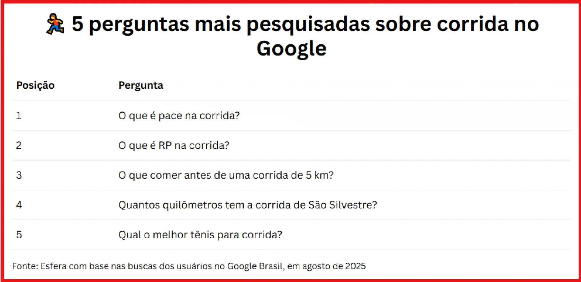 Além de apontar que os termos relacionados à corrida de rua somaram 1,5 milhão de pesquisas, o estudo da Esfera também mapeou as perguntas mais recorrentes dos brasileiros sobre a modalidade.