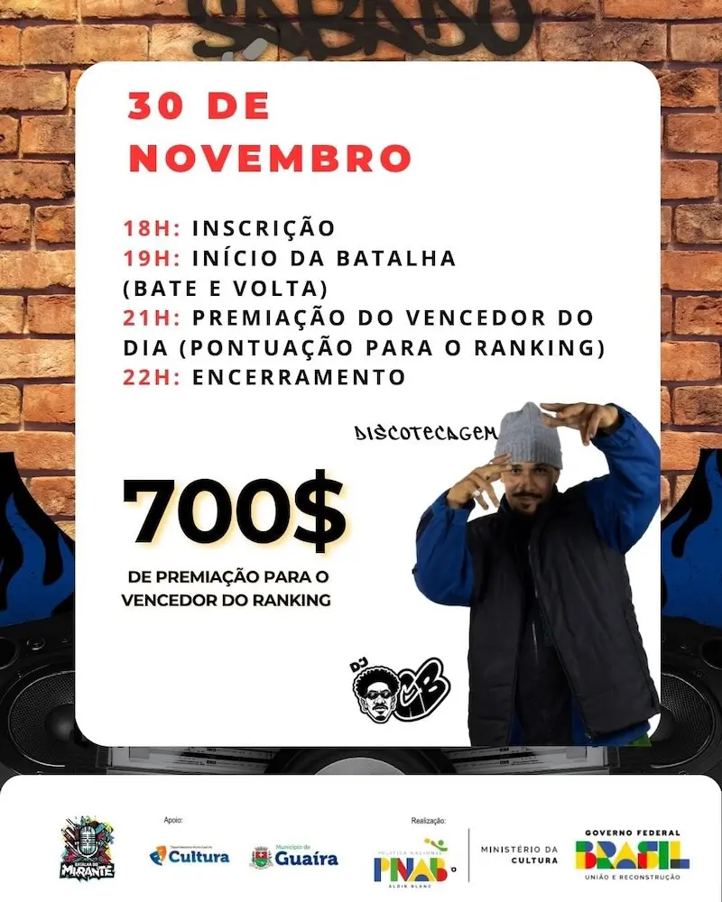 A contagem regressiva começou! A cena do hip-hop em Guaíra está a todo vapor para o evento muito esperado: a Grande Final da Batalha do Mirante. O corre é no próximo sábado, 30 de novembro, e promete fechar com chave de ouro a temporada de rimas e muito flow na cidade.