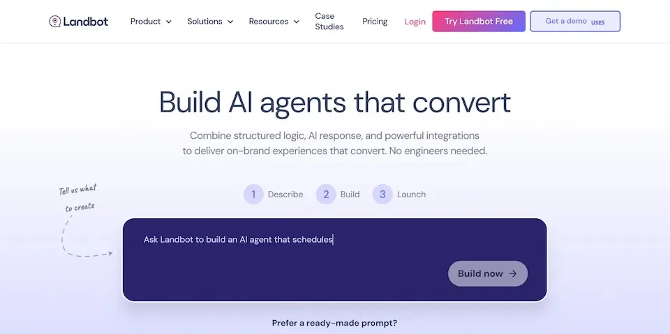 Landbot é uma plataforma no-code para construção de chatbots, conhecida por suas conversas no estilo “chat” no site e no WhatsApp. Ela combina atendimento ao cliente com geração de leads: as empresas usam o Landbot para engajar visitantes do site em tempo real, capturar contatos e oferecer suporte 24/7. Com uma interface visual moderna e até integração de IA (como GPT-4) para compreender linguagem natural, o Landbot foca em criar experiências de conversa amigáveis e personalizadas, tanto para ajudar na conversão de vendas quanto para resolver dúvidas comuns de forma eficiente.