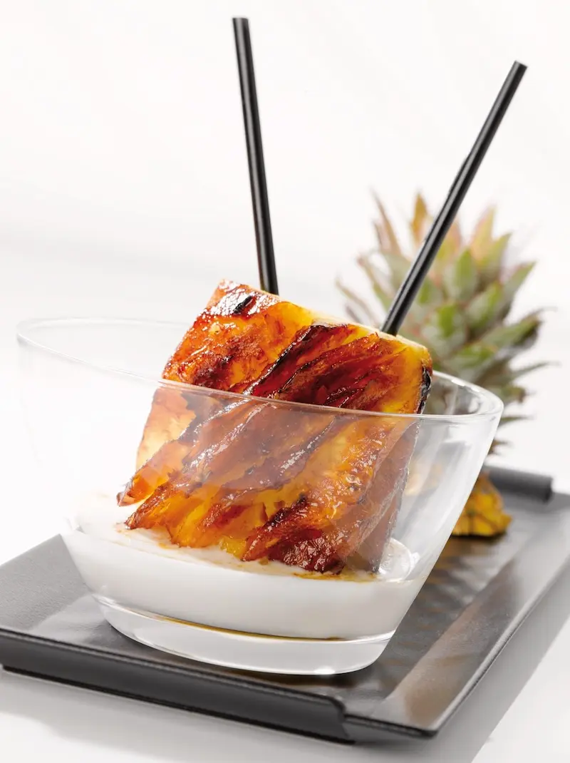 Caramelizar o açúcar e dourar as rodelas de abacaxi na frigideira. Misturar leite de coco com creme de leite e servir com o abacaxi.