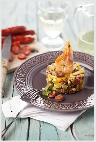 Temperar os camarões com 2 colheres de azeite, suco de limão, sal e pimenta vermelha. Grelhar por 3 minutos. Numa frigideira, dourar as linguiças com 2 colheres de azeite por 5 minutos. Numa tigela, colocar a linguiça e juntar a cebola, tomates, abacate, coentro e misturar bem. Servir em porções individuais e colocar os camarões por cima.