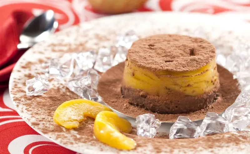 Derreter chocolate com manteiga. Misturar o creme de leite. Montar em taça com camadas de creme e pêssego. Gelar por 2 horas antes de servir.