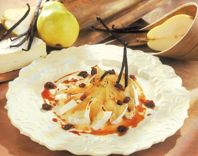 Dispor peras e uvas em travessa. Colocar brie ao centro. Regar com mel e levar ao forno a 180°C por 10 minutos. Finalizar com nozes.