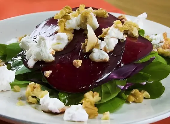 Misturar azeite, balsâmico e mel. Temperar. Em uma travessa, montar com folhas, beterraba e queijo de cabra. Regar com o molho e finalizar com pimenta.