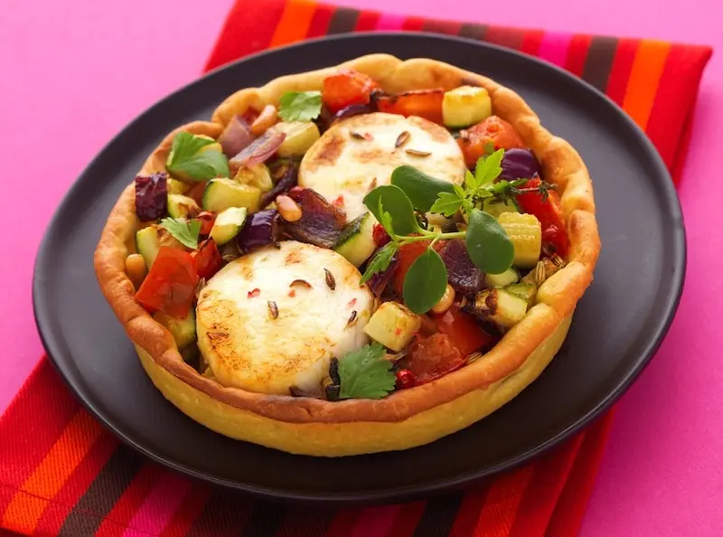 Forrar forminhas com a massa e pré-assar por 8 minutos a 200°C. Rechear com queijo de cabra e dispor os vegetais. Regar com azeite, temperar e assar por mais 12 a 15 minutos.