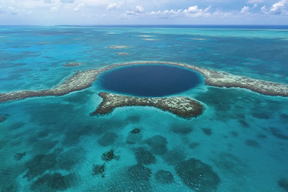 Embora não seja uma ilha ou ilhota, o Grande Buraco Azul é o ponto mais emblemático da região insular de Belize e um dos destinos de mergulho mais famosos do mundo. Localizado no Atol de Lighthouse Reef, a cerca de 70 quilômetros da costa, trata-se de um gigantesco sumidouro submarino quase perfeitamente circular, com mais de 300 metros de diâmetro e cerca de 125 metros de profundidade – visível até do espaço.