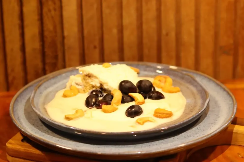 A sobremesa que completa a experiência é o Stollen de Leite em Pó, bolo de receita tradicional servido com creme de framboesa artesanal, uvas e castanha-de-caju.