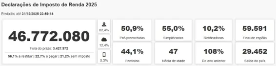 De acordo com dados públicos da Receita Federal, no ano passado, mais de 46 milhões de declarações foram enviadas até o fim do prazo. Deste total, 56,1% tinham IRPF a restituir, 22,7% tinham IRPF a pagar e 21,2% não tinham valores a receber ou a pagar.