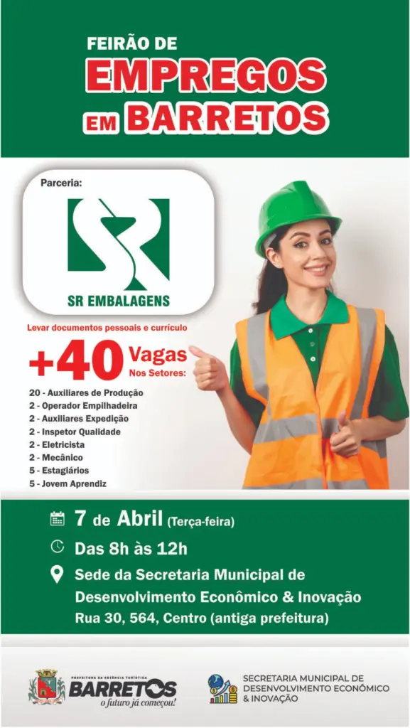 A Prefeitura da Estância Turística de Barretos, por meio da Secretaria Municipal de Desenvolvimento Econômico & Inovação, promove mais um Feirão de Empregos. Desta vez, em parceria com a empresa SR Embalagens, o feirão será realizado na terça-feira 7 de abril com a oferta de 40 vagas de trabalho em diversos setores.