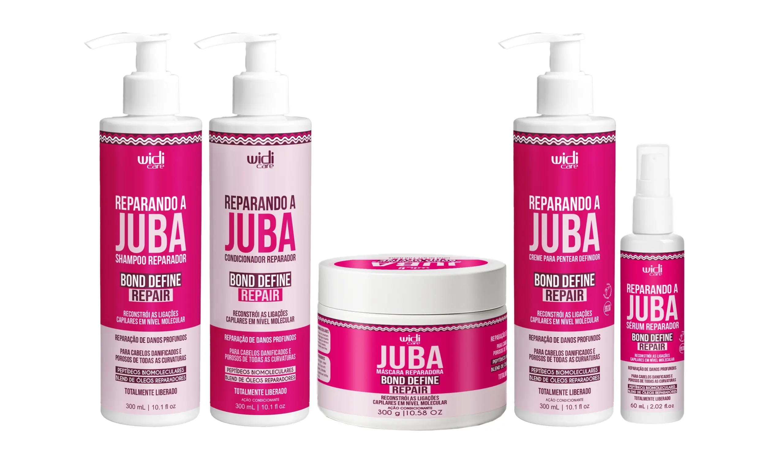 Já para ondulados, cacheados e crespos que passaram por processos químicos ou apresentam perda de definição e resistência, a linha Juba Bond Define Repair combina reparação profunda com hidratação. Formulada com a tecnologia Peptídeos BioMoleculares, atua no córtex, reconstruindo ligações internas e fortalecendo os fios de dentro para fora, enquanto o blend de óleos de ojon, rosa mosqueta e macadâmia promove hidratação intensiva, maciez e luminosidade prolongada. A linha possui shampoo, condicionador, máscara, creme para pentear definidor e sérum reparador, oferece um tratamento completo que corrige danos estruturais, controla o frizz, protege contra agressões externas e devolve definição, movimento e toque sedoso às curvaturas.